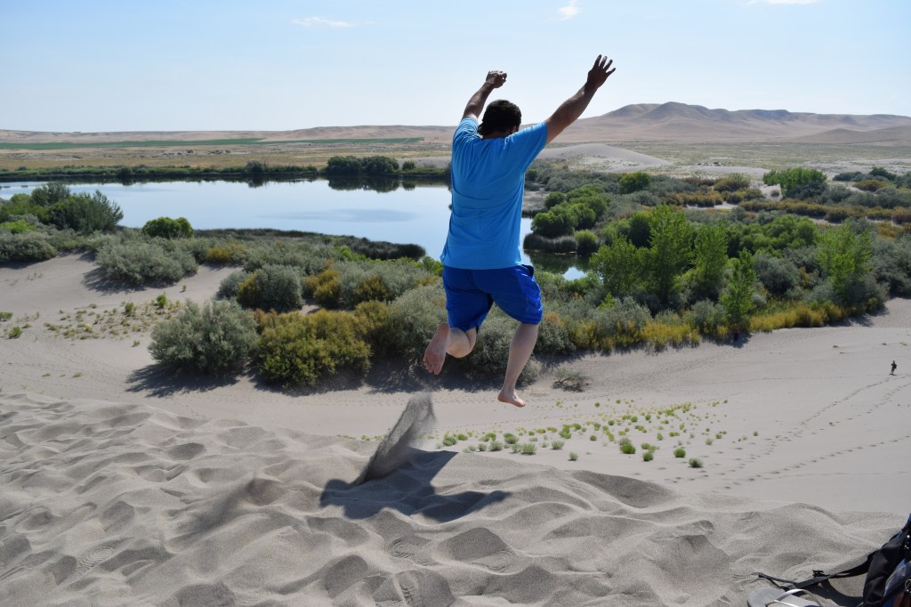 We went to the Bruneau Dunes in Idaho. The picture of Mike on the right does have a story. He’s just beginning a valiant charge down the dune. Little does he know scalding, sun-baked sand awaits his tender phalanges. He was thoroughly singed and soon after reported that he’d, ‘had enough sand dunes for forty years.’