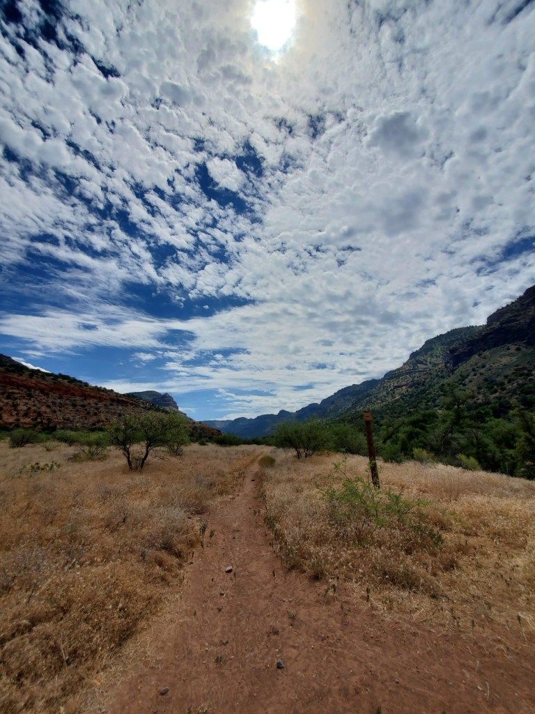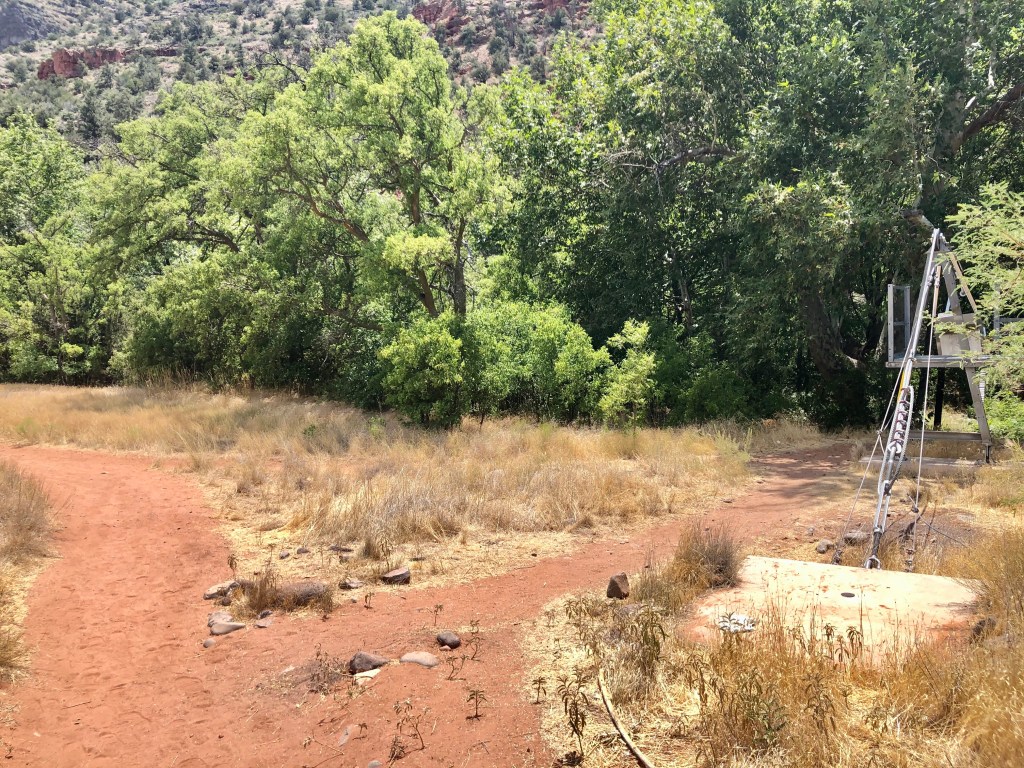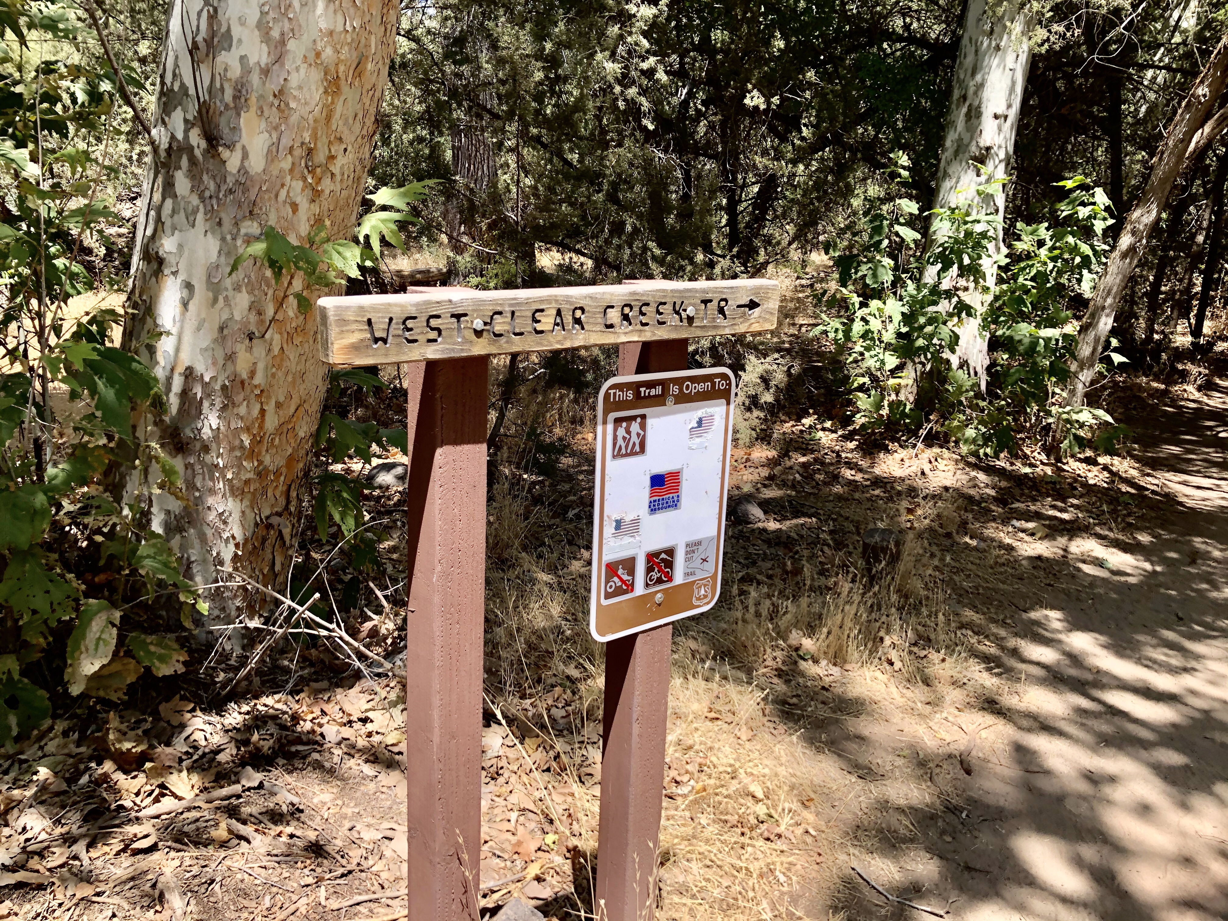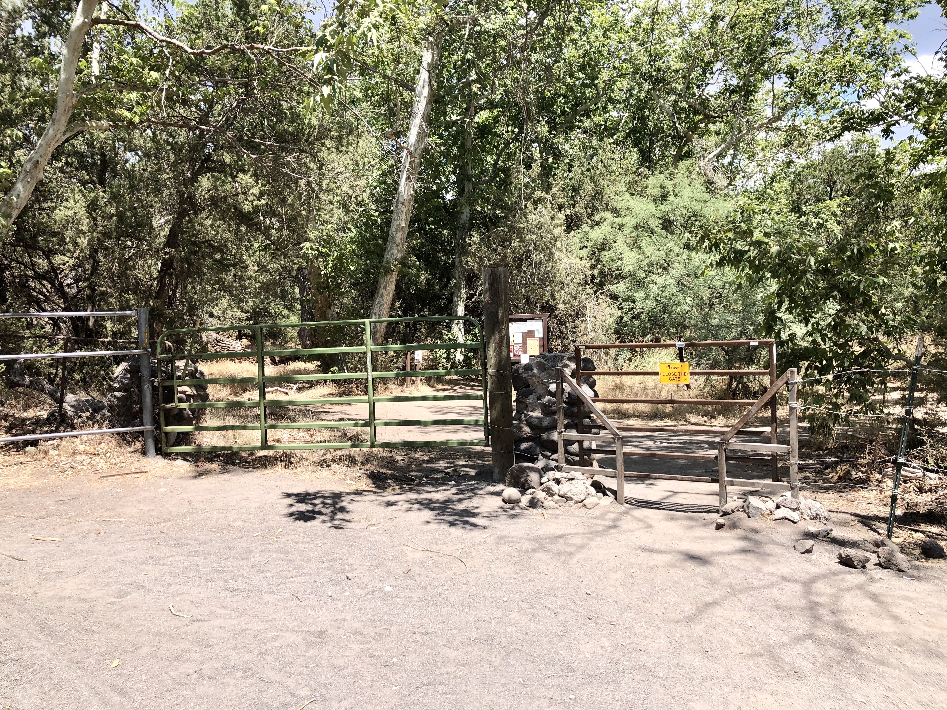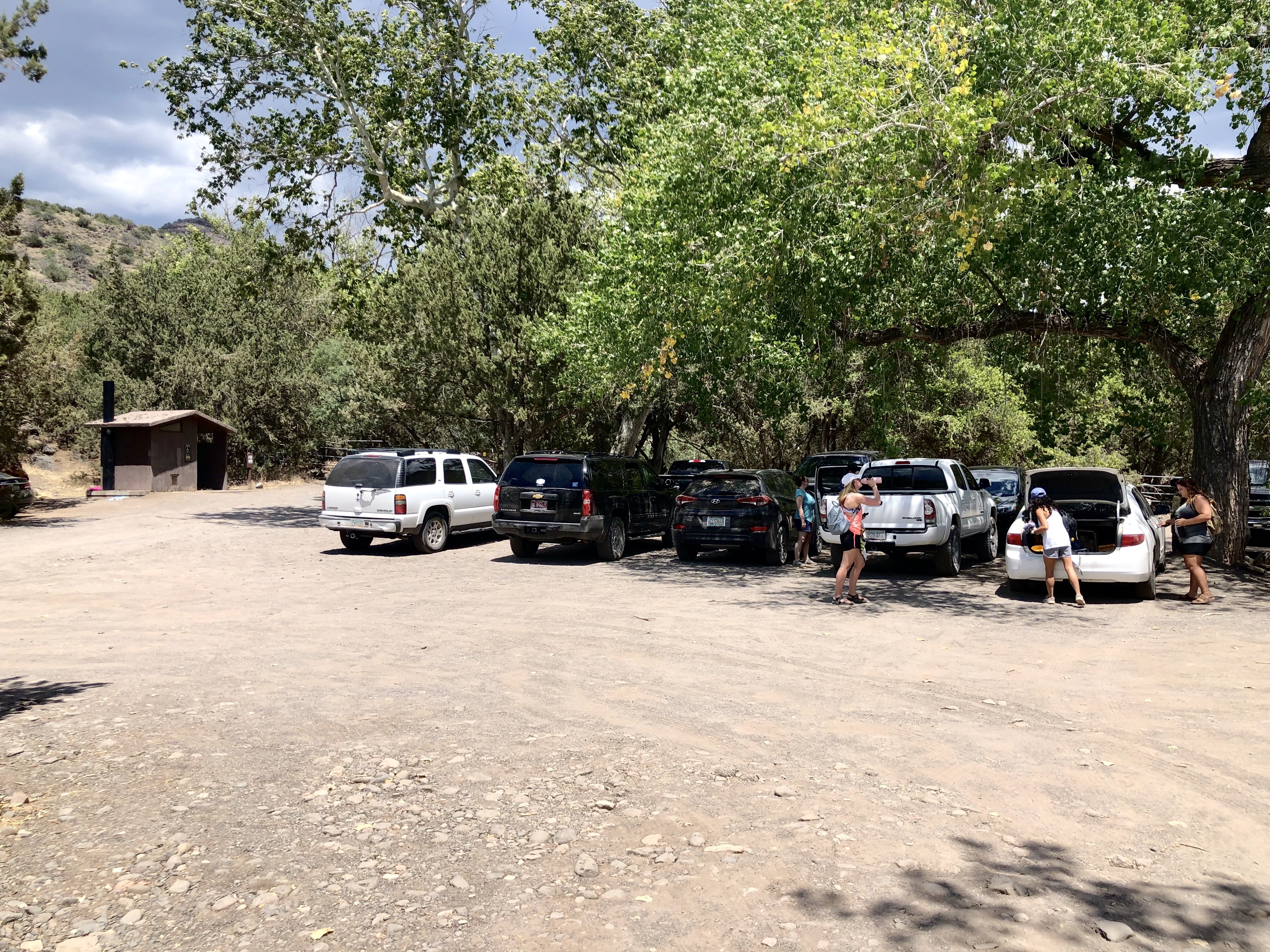 Then continue for another 3.1 miles until you reach a large parking lot. Do not stop driving until the road ends. It’s tempting to pull off too soon. The parking lot and trail head look like this, and there’s a very large gate by the entrance of the West Clear Creek Trail. That’s the trail you want.