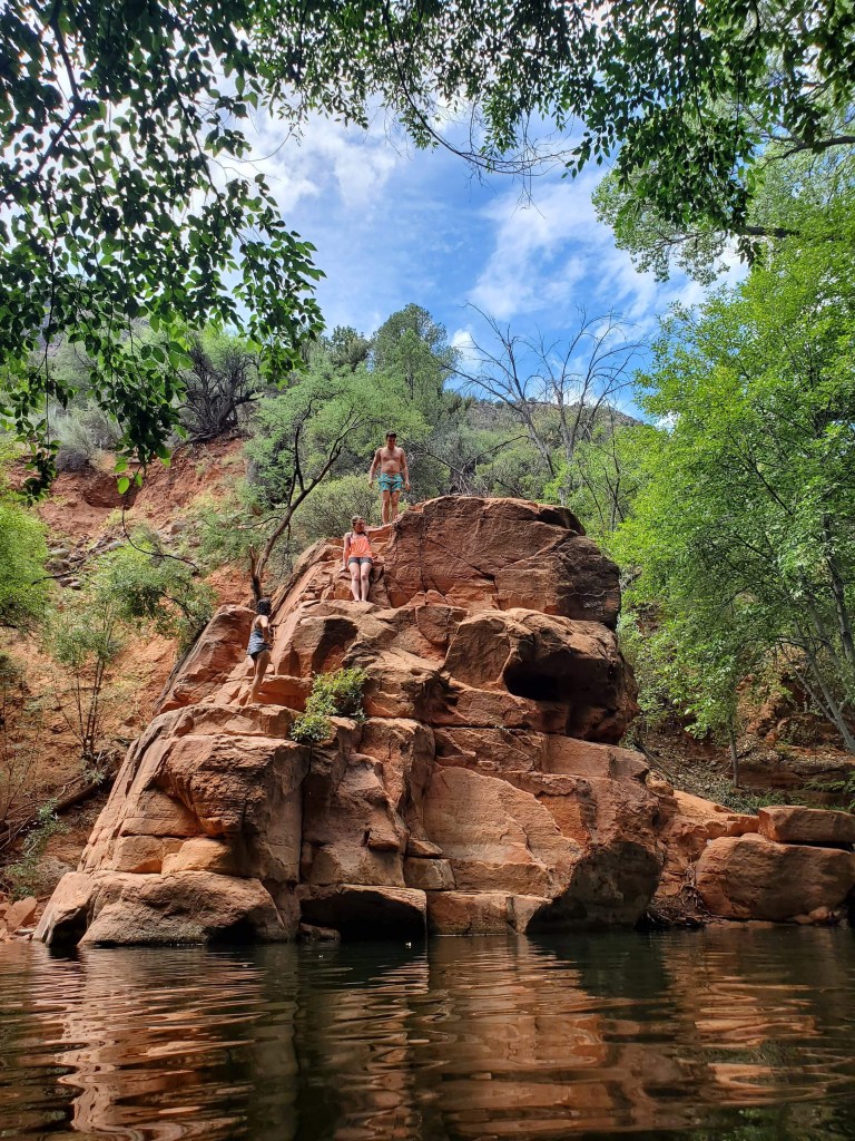 On July 16, Aleisha and I took some friends to the Bull Pen Swimming Hole, a lovely place near Camp Verde. We used directions found on this website to get there, but we had some trouble finding our way. Below are pictures of our excursion as well as directions on how to get there. The swimming area is lovely, there’s a 20 foot jumping rock, and the hike is less than 1 mile.