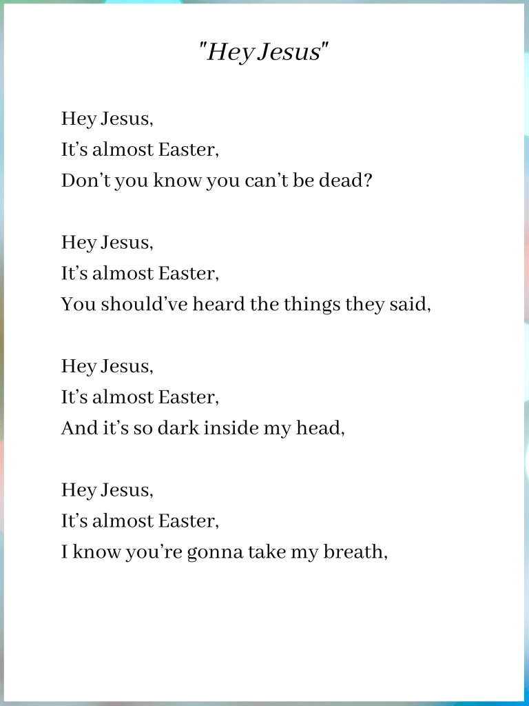 Hey Jesus Posted byjavenbearApril 3, 2021December 5, 2022Posted in2021, Poetry, Uncategorized a short poem for Easter this year. Share this: Click to email a link to a friend (Opens in new window) Email TweetLike Loading... Published by javenbear Javen Bear is 27 years old and lives in Phoenix, Arizona. He serves on staff at Open Hearts Family Wellness. This is where he thinks out loud. View more posts
