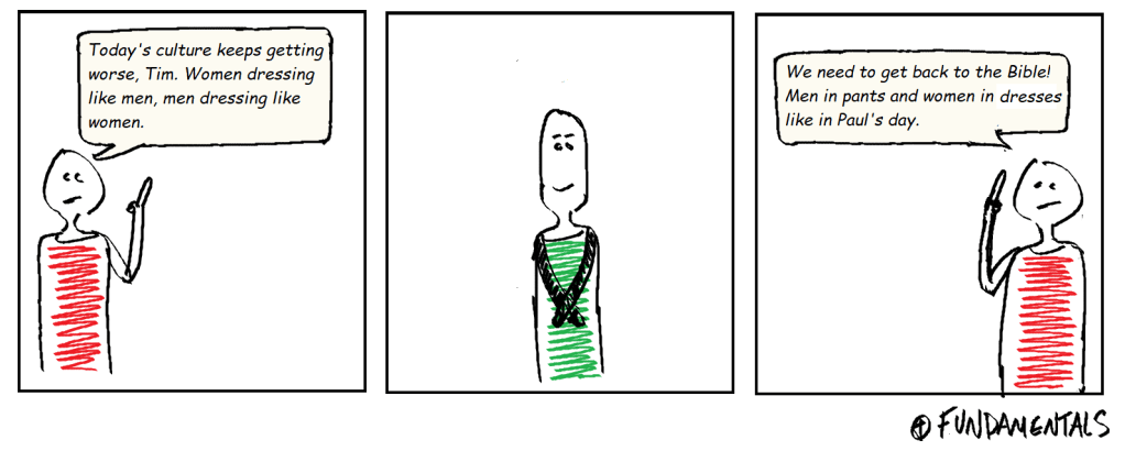Those who fret about the perpetual worsening of culture often have a very short memory and very little conception of the things which have happened in the distant and not so distant past. It wasn’t terribly long ago we were burning people at the steak for translating the Bible – closer than that was owning other people so we could get richer – closer than that was only letting certain colors of people in our businesses. Yet we’re often ingrained with this idea that things are generally getting worse and worse. Often our remedies have little to no grounding in scripture, like Jimothy’s solution for men and women’s dress.