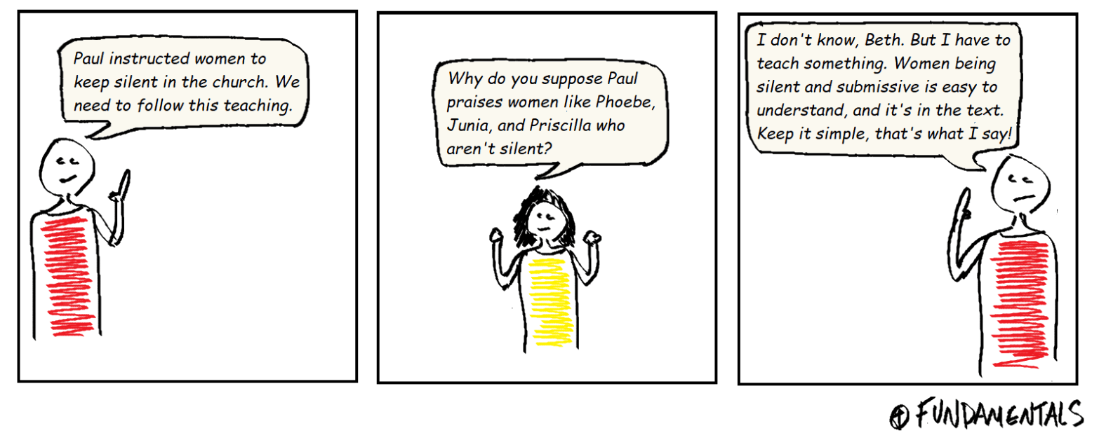 Jimothy here is at least honest. Some ultra-complementarians (like John Piper) admit there are pieces of scripture where women are praised for doing things that don’t reckon with their theological picture of gender roles/design. At the end the day, or the beginning rather, preachers have to preach something. And something that’s black and white is easier, even if it’s not faithful to the teaching in scripture and even if it subjects half their congregation to a limited existence.