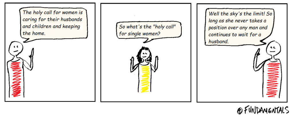 What an impossible situation this puts so many young ladies in. Here is an entry point into the discussion about ideals. Some may argue that marriage isn’t necessarily required or even expected. Yet when we consider the norms, the unspoken expectation, the way social power is gained, it seems clear marriage is of high priority. So Beth’s question in a pertinent one – what’s the holy call for single women?