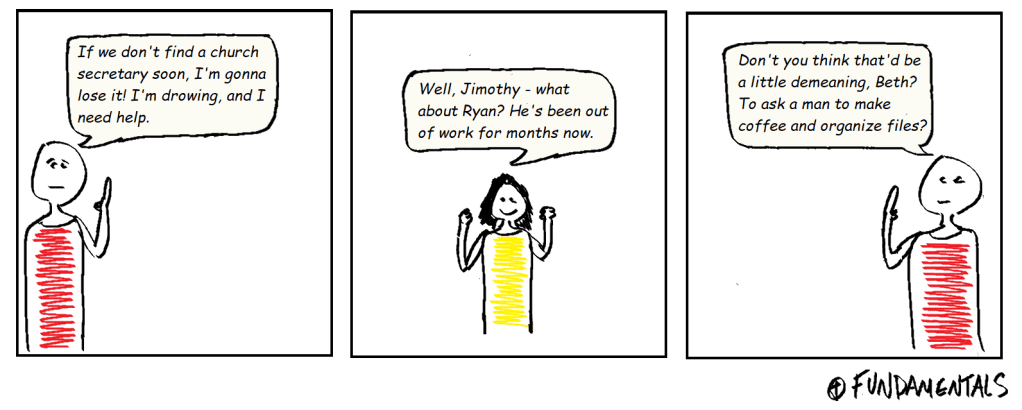 When we don’t even consider hiring men for positions we’d prefer to fill with women because a man would find it demeaning, all we have to do is take a small step back to see how low of a view of women we have. Jimothy’s argument here is that a man would be insulted by the notion of taking a position traditionally filled by women. What’s implied (if not said outright) is that women can expect less because they are capable of less. Men can expect more because they are capable of more.