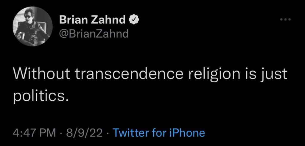Brian Zahnd recently Tweeted, “Without transcendence religion is just politics.” And I’ve been thinking about that ever since I read it.
