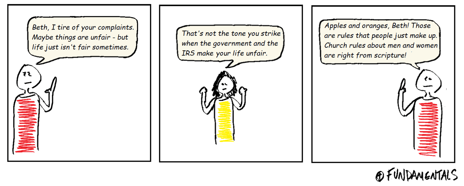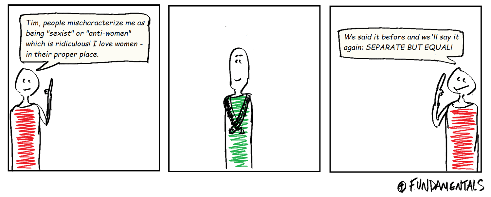 The logic of being completely different and kept apart (while still being “equal”) was employed during the Jim Crow era to keep black children out of all white schools. Eventually, even white people realized how ridiculous this logic was and were forced to integrate. This same kind of logic is employed in churches where men’sContinue reading “Feb 20”