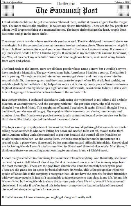 - A short essay (“The Reverie”) Javen writes a 650 word piece about real life, usually related to counseling, observations rom the therapy room, funny stories, or whatever else he is thinking about.