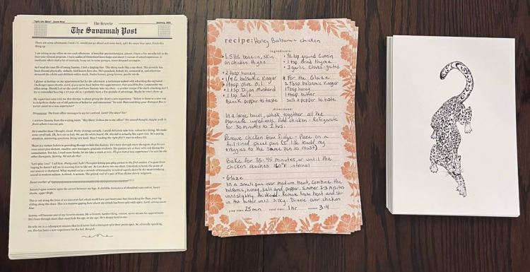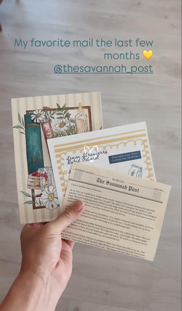 This is for old friends, new friends, and anyone who loves to get fun mail. We mail it monthly, and it contains four special items*. At the bottom of the page are some examples from past editions.